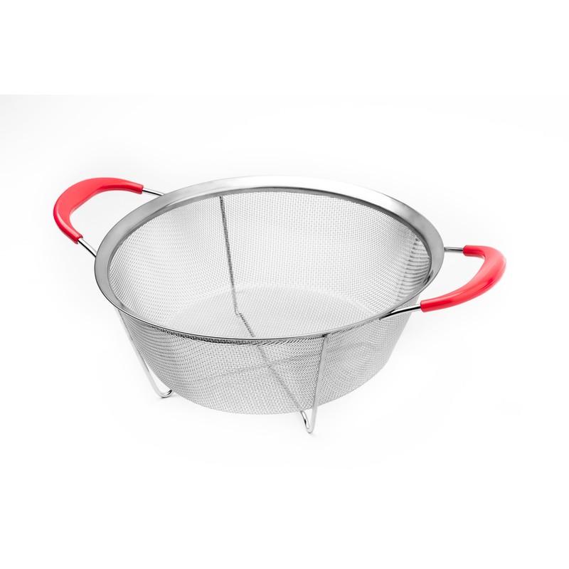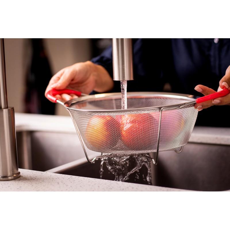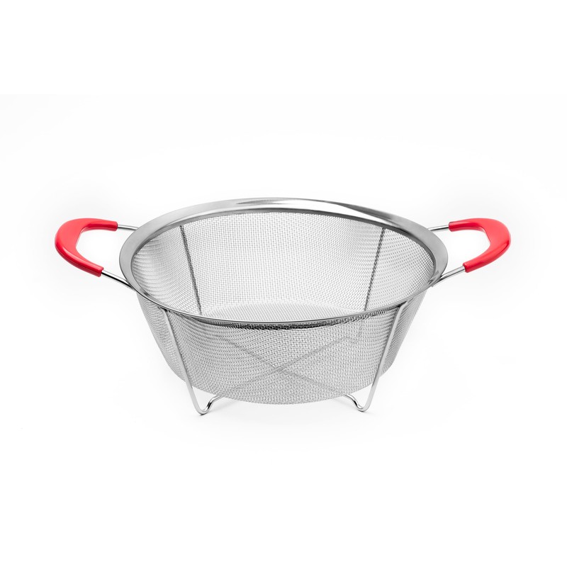 - Hercules Chef by Mundial 9.8-inch (25 cm) Stainless Steel Basket Colander Strainer with Silicone Red Handles.
