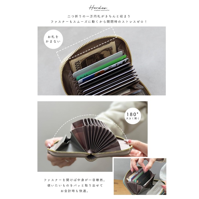HERDES Women's Mini Wallet, Bi-fold, Genuine Leather, Elephant, Bifold Wallet, Compact, Large Capacity, Card Case, Chabara, Coin Purse, Small, Thin, smoke blue