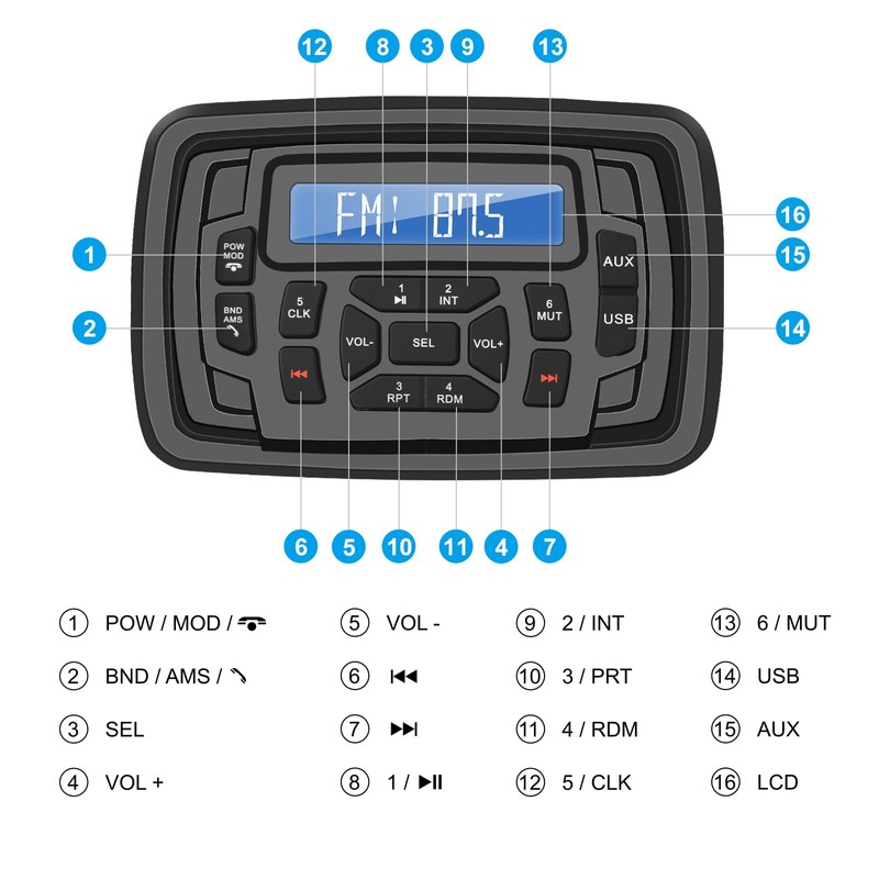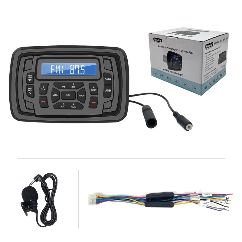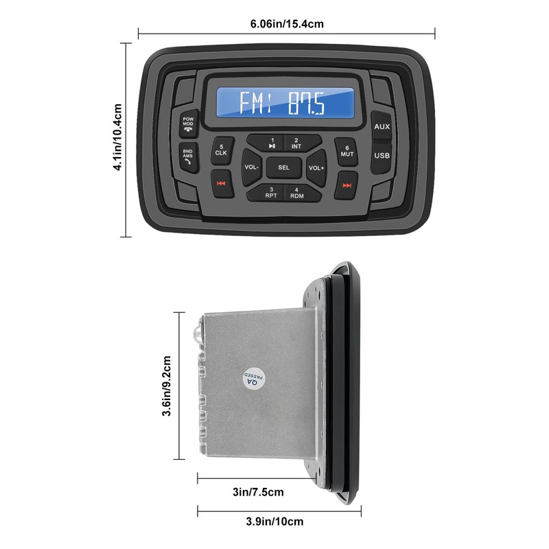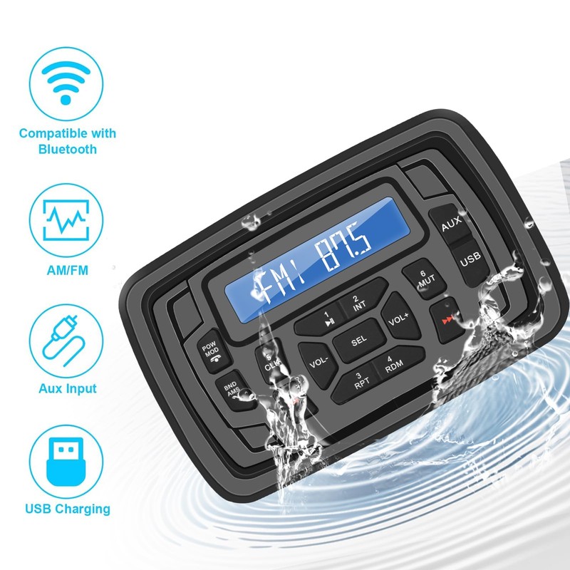 Radio FM/AM,USB/MP3 Player, Bluetooth Wireless Music 1)Radio, 12 FM/MW Radio presets allows you to preset your favorite radio and listen to it directly next time. 2)Bluetooth Wireless Music:Directly listen the music wirelessly on your Bluetooth Device; 3)USB input available for Connecting MP3 players or flash drive. 4)RCA Aux-in for connecting iPod, or portable satellite radio Waterproof Level: IPX66, ASTM 117 salt/fog standard Hit the water and enjoy your music with the marine grade stereo. With an IPX6 Rating and ASTM 117 salt/fog standard, state-of-art olid aluminum chassis, weatherproofing Smaterials and UV coatings, this radio is protected from the elements. Easy to Install and fully compatible Product Dimensions (L x W x D): 6.1”(155mm) x 4.1”(105mm) x 1.57”(40mm) Installation Dimensions(L x W x D): 5.5”(140mm) x 3.54”(90mm) x 3.14”(80mm) It is compatible for many ATVs, UTVs XP900, Powersports Vehicles, Boats, Heavyduty Car Vehicles, even in SPA rooms. 4 channels x 45 watts Built-in Power Audio Amplifier Use the best audio amplifier to rock the music on the move! Power Supply: 12V What you get Marine Stereo Headunit x 1PCS, Install Bracket x 1PCS, USB Extension Cable x 1PCS, Product Manual x 1PCS; Plus, 1 Year Electronics Product Warranty!