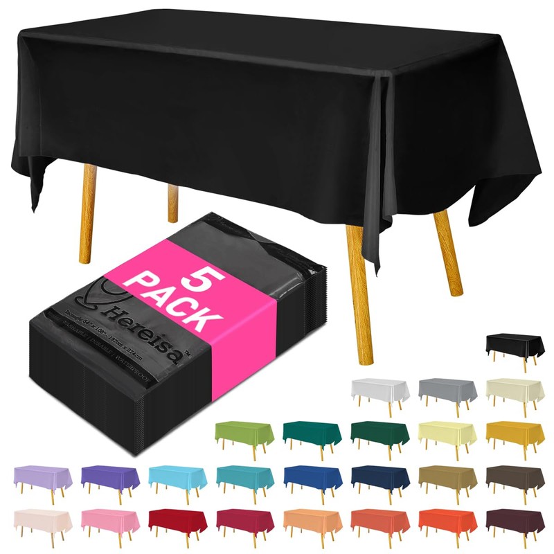 Hereisa Disposable Plastic Tablecloth Black 54x108 Inch, 5-Pack Waterproof Rectangular Table Cover for Parties, Picnics, Dining Protection