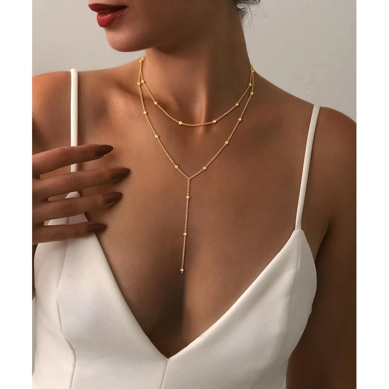 - Elegant Gold Lariat Necklace: Layered beaded chain drop necklaces for women trendy are finely crafted and suitable for everyday wear.Lariat necklace for women is a simple piece of jewelry that pairs perfectly with a V neckline and pairs perfectly with other chain necklaces,perfect for many occasion such as parties, weddings, ceremonies, dates and many more