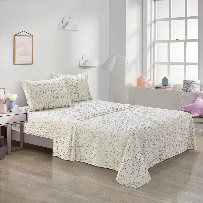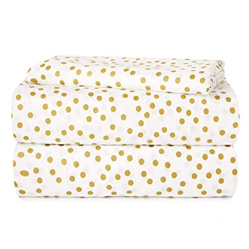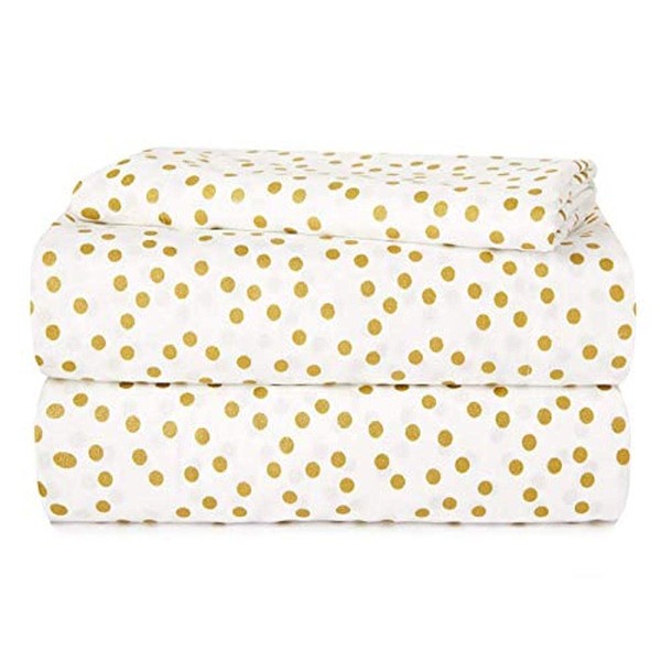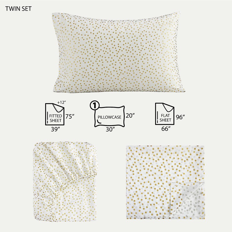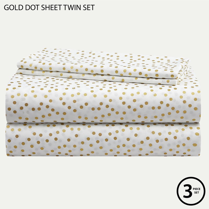 - DESIGN: Metallic Gold Polka Dots are printed on this bright white sheet set for a fun and modern look. Neutral in color and design, this sheet set can pair well with a variety of styles and design preferances. Perfect for kids, teens and young adults of all ages!