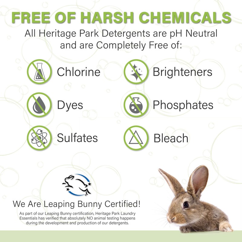 At Heritage Park, we feel simple is better. We don't see a need for a different detergent for every item you own. Our Silk & Wool, All-Purpose, and Baby & Toddler laundry soaps cover all your fabrics without the clutter. We offer cleaning solutions perfect for everyday use in a standard or high-efficiency washing machine, or to hand wash your most delicate items and keep your favorite washables looking and smelling their best. Our Leaping Bunny certification means our products and ingredients are never tested on animals during development and production. All Heritage Park detergents are made in the USA.
