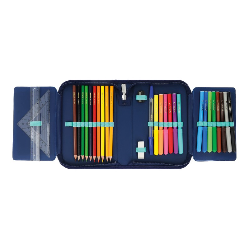 - Filling: 14 felt tip pens, 8 triangular coloured pencils, 1 triangular pencil, 1 sharpener, 1 eraser, 1 ruler 16 cm, 1 set square, 1 ballpoint pen, 1 timetable, 1 name tag