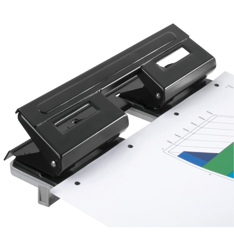 Locher (Büro) Doppel-Locher 1,5mm schwarz mit Anschlagschiene. Werkstoff: metall. Lochung: Standard- DIN-Abstand 3 x 80mm. Ausführung: 4 Stanzsegmente, Anschlagschiene vorhanden, max. Einstell-Format: A4. Stanzleistung: 1,5 mm/15 Blatt. Farbe: schwarz.