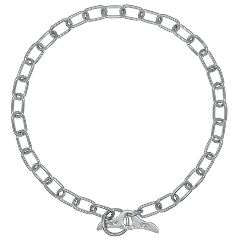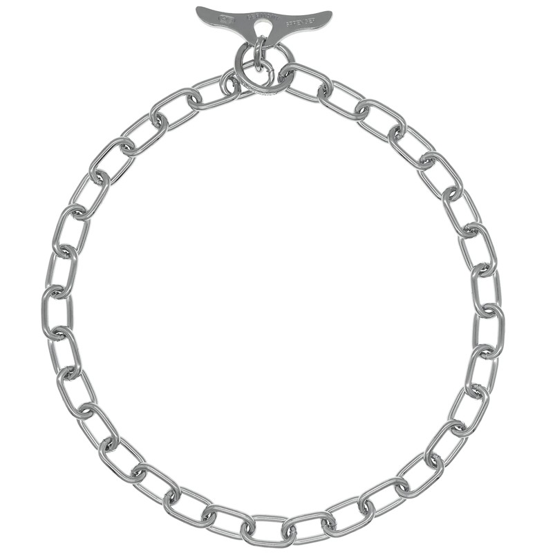 High gloss, chrome plated steel choke style chain has medium links and is suitable for dogs with long and fine fur. Widely spaced wire will prevent the fur from entangling and twisting within the collar.