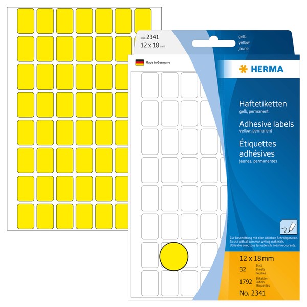 - Box contents: 1792 x HERMA 12 x 18 mm rectangular yellow multipurpose labels (32 sheets of 56 labels)