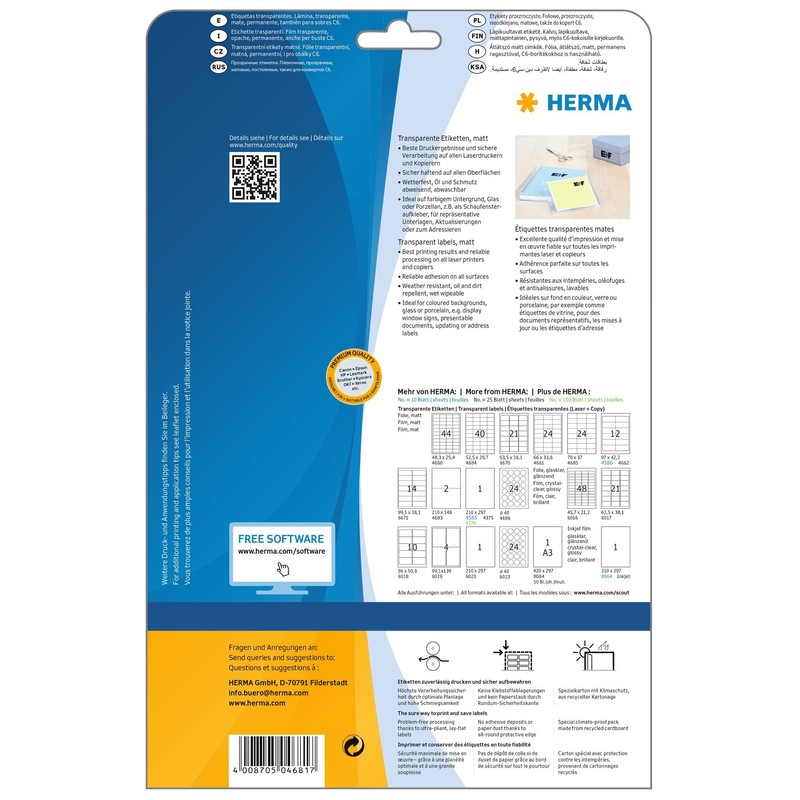 - Box contents: 600 x HERMA transparent film labels, DIN A4 format, 6.6 x 3.38 cm, rectangular, clear (25 sheets each 24 labels)