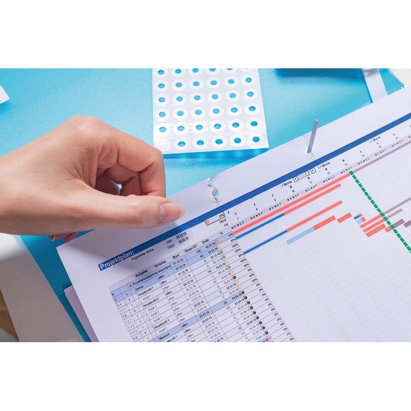 - Lochverstärkungsringe aus reißfester Kunststoff-Folie, zum Reparieren ausgerissener Lochungen