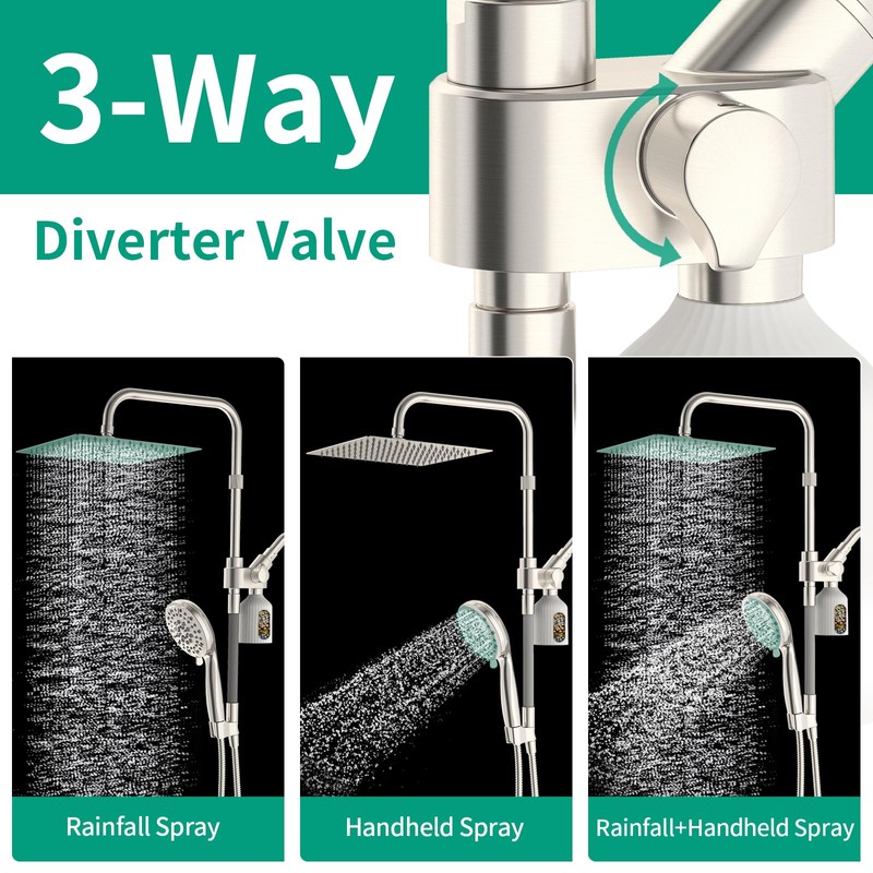 - 【Multiple Shower Modes】Our handheld shower has 6+1 different shower modes to choose from. Simply slide the paddle on the hand shower panel to easily switch to modes such as massage or saturating. The powerful jet mode on the back of the hand shower helps you to clean floor tiles, toilets and even hard-to-clean corners in a targeted manner. In addition, the 3-way diverter valve on the extension arm allows you to easily switch between the rainfall shower and the handheld shower.