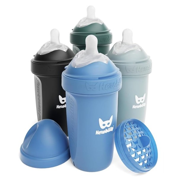 Herobility Double Anti-Colic Baby Bottles – 8.5 fl oz/240ml – 4-Pack – BPA-Free - Multicolor – Denim, Black, Dusky Green, Gray