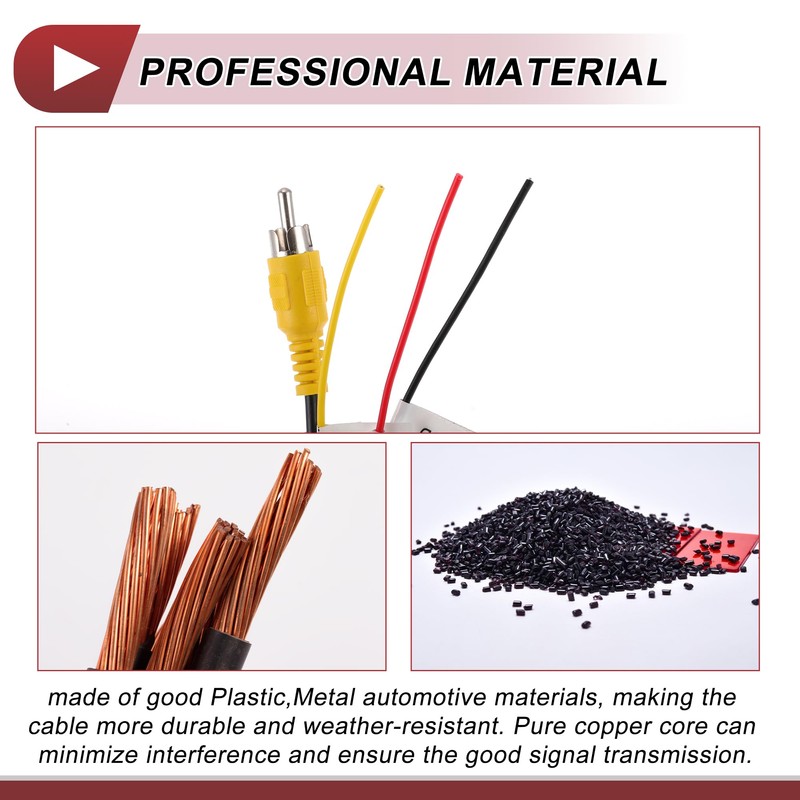 Rear view camera input cable made of good plastic, metal automotive materials, making the cable more durable and weather-resistant. Pure copper core can minimize interference and ensure the good signal transmission.