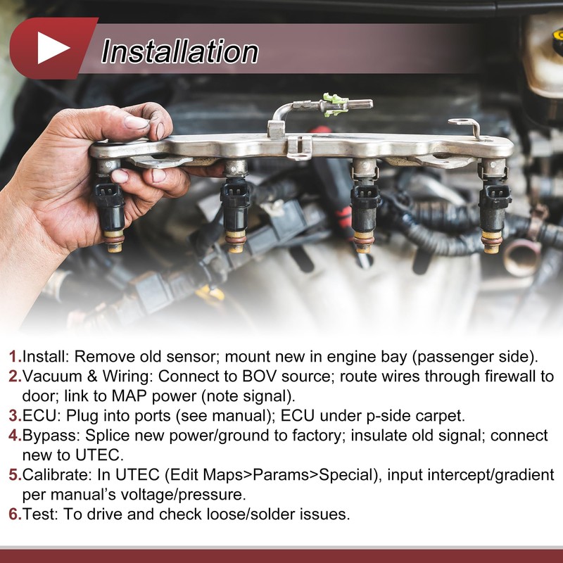 - Installation: 1.Install: Remove old sensor; mount new in engine bay (passenger side).2.Vacuum & Wiring: Connect to BOV source; route wires through firewall to door; link to MAP power (note signal).3.ECU: Plug into ports (see manual); ECU under p-side carpet.4.Bypass: Splice new power/ground to factory; insulate old signal; connect new to UTEC.5.Calibrate: In UTEC (Edit Maps>Params>Special), input intercept/gradient per manual’s voltage/pressure.6.Test: To drive and check loose/solder issues.