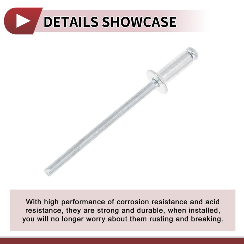• Easy / Professional Installation: Installation Steps for Blind rivets: 1. Blind rivets are fasteners used to connect two materials together without the need for access to both sides. 2. The installation process involves placing the rivet into a pre-drilled hole, 3. then using a rivet gun to pull the mandrel, expanding the rivet and securing the materials in place.