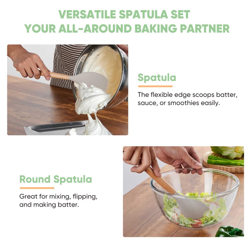 - Easy to clean & Space-Saving, the silicone rubber head firmly embedded with wooden handle, will not break and fall off, sturdy for everyday cooking, non-porous surface of silicone prevents food from sticking, reducing residue and scrubbing, easy to clean and dishwasher safe, with hanging holes for quick drying and easy storage