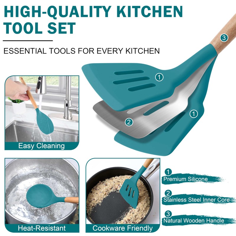 We have selected this 8-piece silicone kitchen utensil set for your daily kitchen use, which means you don't have to spend extra money on duplicate cookware tools. Essential kitchen utensils include: spaghetti server, soup ladle, slotted turner, solid spoon, slotted spoon, spatula, round spatula, egg whisk. A great gift for your friend, family who loves to cook.