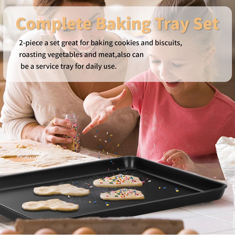 - MULTI-PURPOSE: Nonstick baking trays set of 2, Size 31.5x24.5x2.5 cm, Great set fit in most ovens, Carbon steel sheet pans perfect for baking cookies, brownies, biscuits, pizza, bread, vegetables and meat, Also can stacked together for space saving in the kitchen