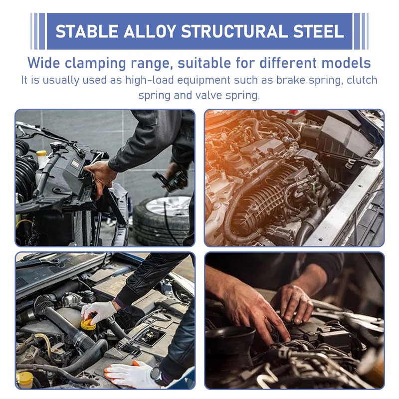 - Aplicaciones versátiles: ideal para una variedad de tareas de reparación automotriz, nuestra herramienta de compresor de anillo de pistón es adecuada para su uso en talleres, garajes e incluso en el campo. Se puede utilizar para reconstrucciones de motores, mantenimiento de rutina y reparaciones de emergencia, proporcionando una solución confiable y eficiente para todas tus necesidades de instalación y extracción de anillos de pistón