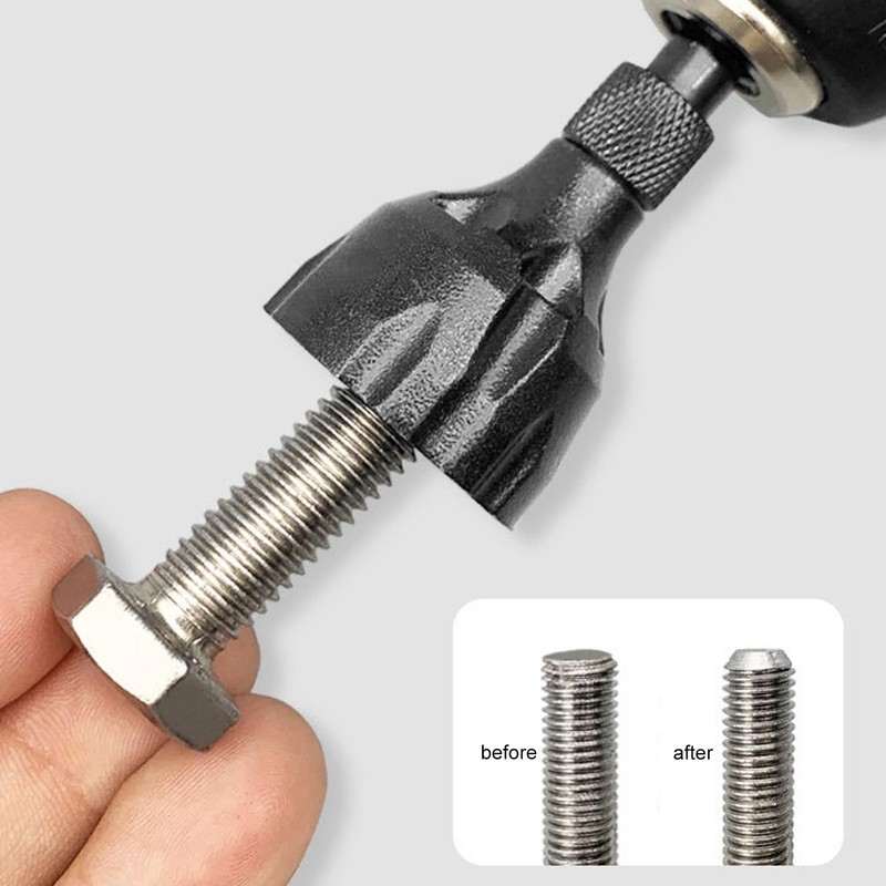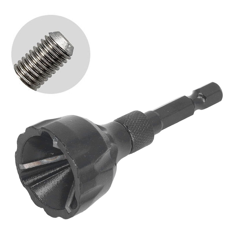 - FUNCIÓN: Diseñada para reparar tornillos y sujetadores dañados, esta herramienta de biselado externo para desbarbar fácilmente afeita los bordes exteriores de tornillos, tubos o varillas para eliminar las rebabas.