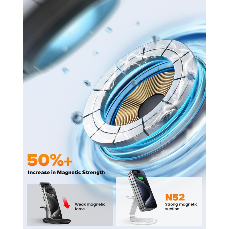 - N52 Powerful Compatible with Magsafe Charger: The 3 in 1 magnetic wireless charger station has newly upgraded magnetic suction, which enables instant charging of iPhone and increases charging efficiency by 25%, bringing you a fast and stable magnet wireless charging experience. This wireless charger stand compatible with magsafe Charger is specially designed for iPhone16/15/14/13/12 series, It is recommended to wear a magnetic phone case or no case.