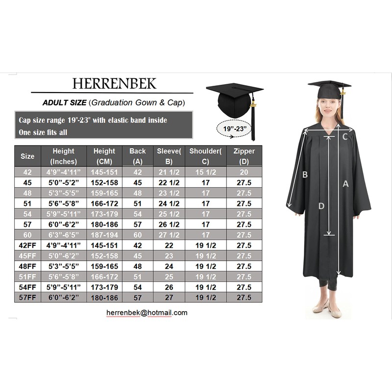 - Size: Masters gown size range 42”-60“, Please refer to the size chart to select the appropriate size. Cap size range 19”-23“with elastic band inside,one size fite all.