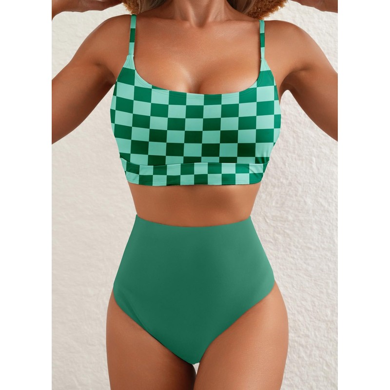Herseas 2 Piece High Waisted Bikini Set for Women 2025 Daisy Pattern Spaghetti Straps Swim Top with Reversible Bottom Bathing Suit Green Checkerboard X-Large