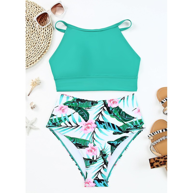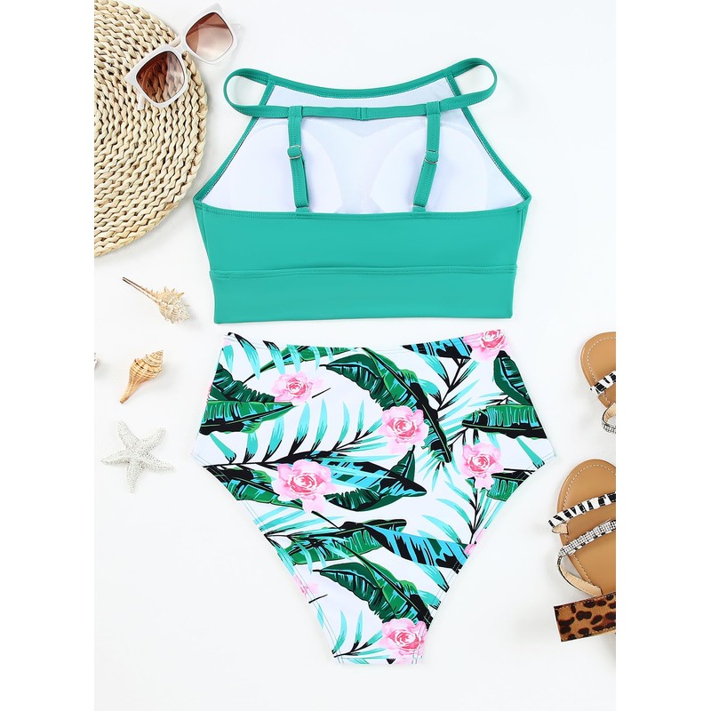 Herseas Womens Bikini Sets High Neck Foral Bikini High Waisted Full Coverage Swimsuits Adjustable Spaghetti Strap Crisscross Back Green Bathing Suits Medium