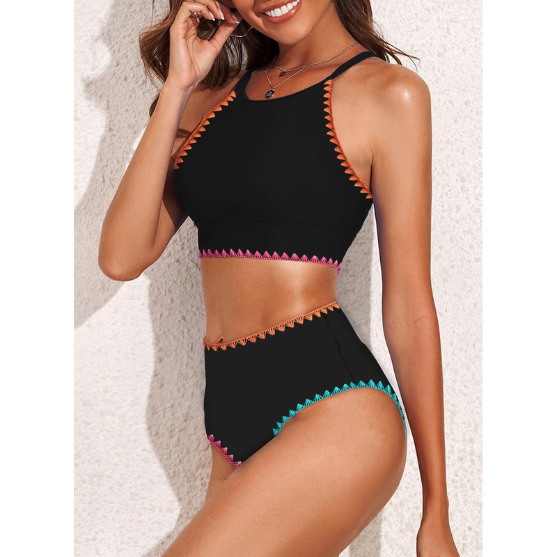 Herseas Womens Shell Stitch Bikini Sets Solid High Neck Top Floral Print Bikini Bottom High Rise Two Pieces Swimsuits Cute Teen Tummy Control Black Bathing Suits Medium