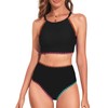 Herseas Womens Shell Stitch Bikini Sets Solid High Neck Top Floral Print Bikini Bottom High Rise Two Pieces Swimsuits Cute Teen Tummy Control Black Bathing Suits Medium
