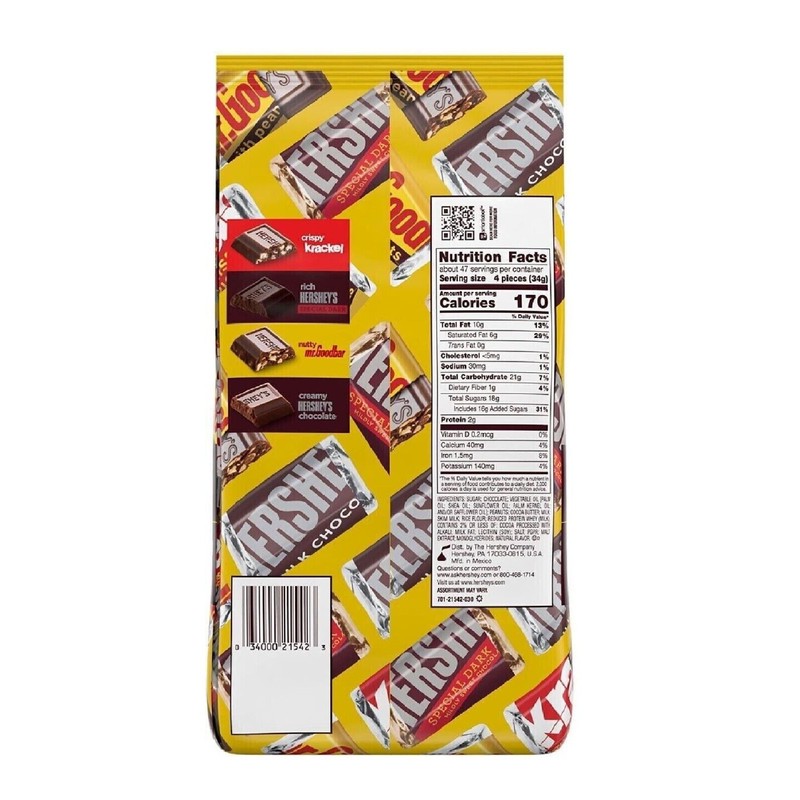 There's something for everyone in this HERSHEY'S Miniatures assortment. Find miniature versions of all your favorite HERSHEY'S chocolate bars in one sweet bag, including HERSHEY'S milk chocolate bars, HERSHEY'S SPECIAL DARK mildly sweet chocolate bars, KRACKEL chocolate candy with crisped rice and MR. GOODBAR chocolate candy with peanuts. Enjoy delicious candy classics individually wrapped for lasting freshness and convenience all year long. Perfect for lunch boxes, movie nights, game nights, snack breaks, sharing moments and candy dishes at home and in the office, these milk and dark chocolate miniatures will keep your snacking fun and simple.