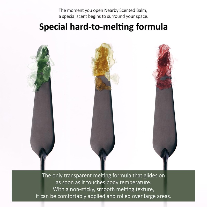 - SCENTED BALM – NEARBY Scented Balm is a vegan scented balm that has a special transparent melting texture that gently melts at body temperature, giving skin shine and moisture. The delicately adjusted scent blends harmoniously the moment it touches your skin, comforting your mind and infusing new energy. Silicone oil FREE / Alcohol FREE, safe even for sensitive skin. Enjoy a daily ritual routine provided by a highly fragrant hypoallergenic solid perfume that is natural and vegan-friendly!