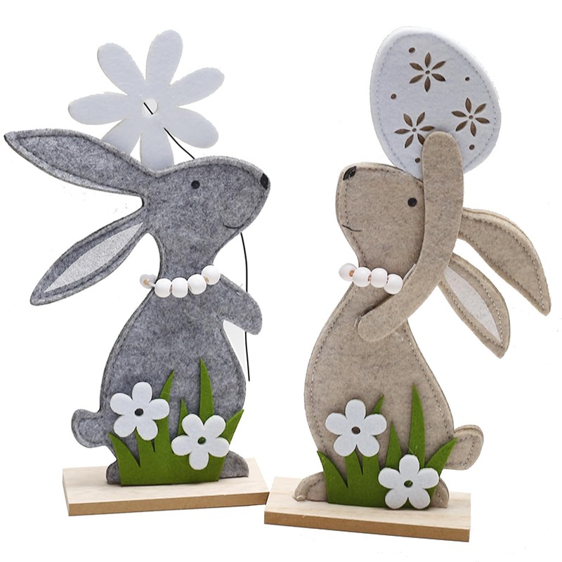 - Our Easter bunnies are made of lightweight felt material and include a wooden base for easy standing