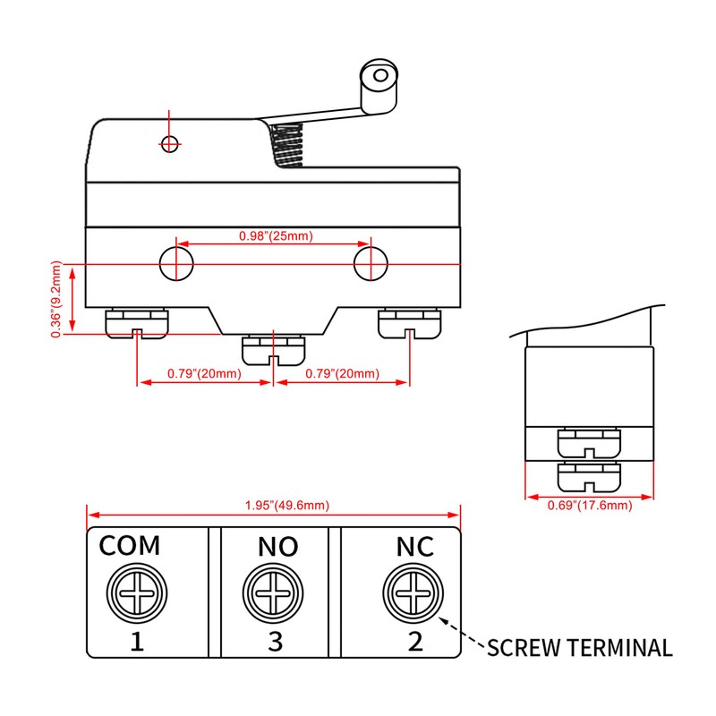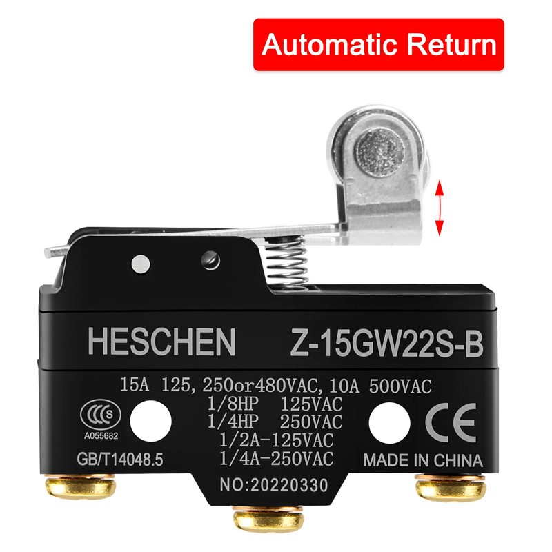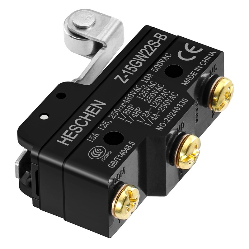 Heschen Small Micro Switch, Z-15GW22S-B, Momentary Contact Short Hinge Roller Lever, 3 Screw Terminal, 15A Rated Current