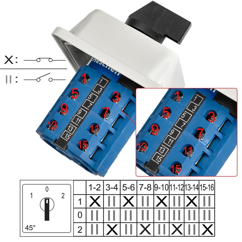- Parameters: Ui: 660V, Ith: 20A; Position: 3 positions (1-0-2), 16 terminals