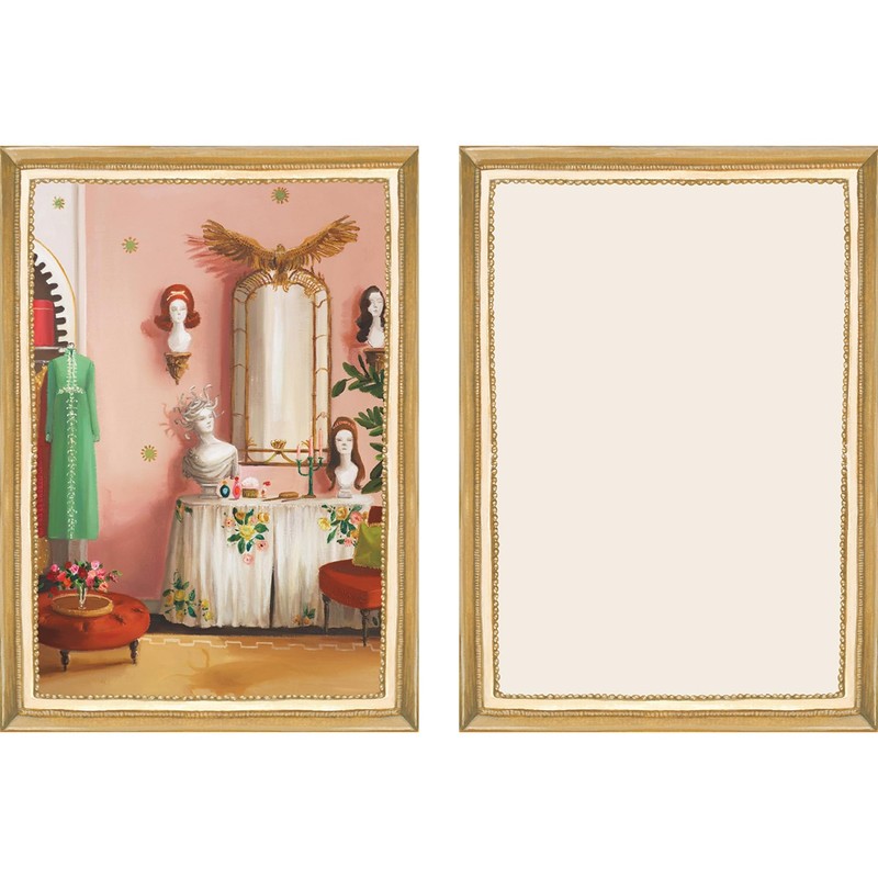 Artisitic Janet Hill blank greeting cards with gold border in a boxed set with 6 cards and envelopes. Each card measured 7 x 5 inches leaving plenty of room to write that special message. All cards are designed and printed in the USA.