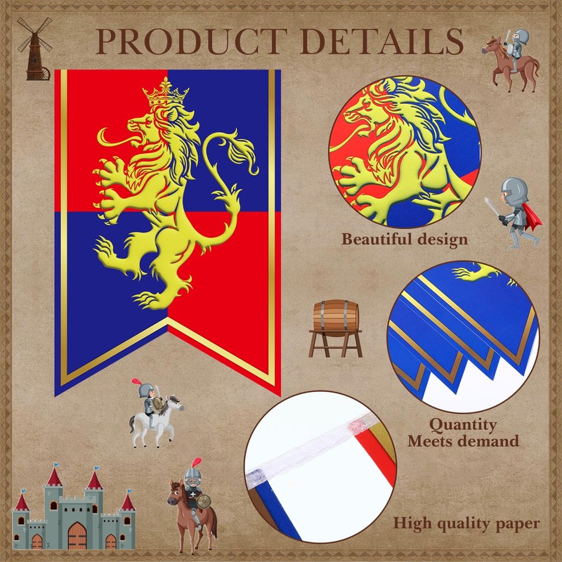- Back to Medieval: Each knight banner in this set is intricately designed with a lion emblem, symbolizing strength, courage, and royalty - all characteristics associated with medieval knights. The rich colors and detailed patterns of these medieval party supplies will transport your guests back in time to the age of chivalry and honor.