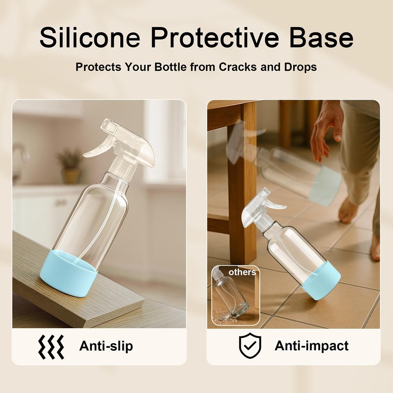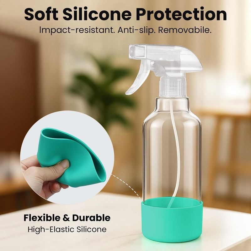 - PREMIUM GLASS SPRAY BOTTLES & STURDY SILICONE SLEEVE: Our glass sprayers are crafted from high-quality material, ensuring for daily use with cleaning solutions, hair products, or plant care. The included silicone sleeve ensures minimizing the risk of breakage and slips, making it safe for daily use.