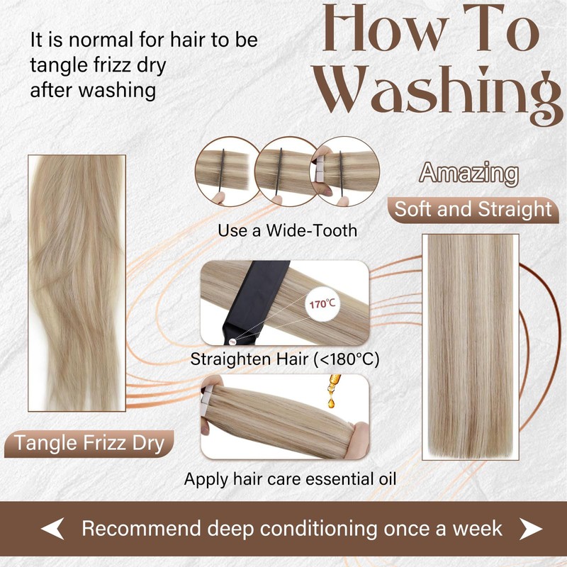 - About Tape: The tape of Hetto Tape in Hair Extensions is double-sided tape, we use professional American white glue so it's hypoallergenic and sticky. Apply it with"sandwich" way and heat it for a few seconds, it will be more firm! And we send additional free replacement tapes with each pack of hair in case that you need to replace it.