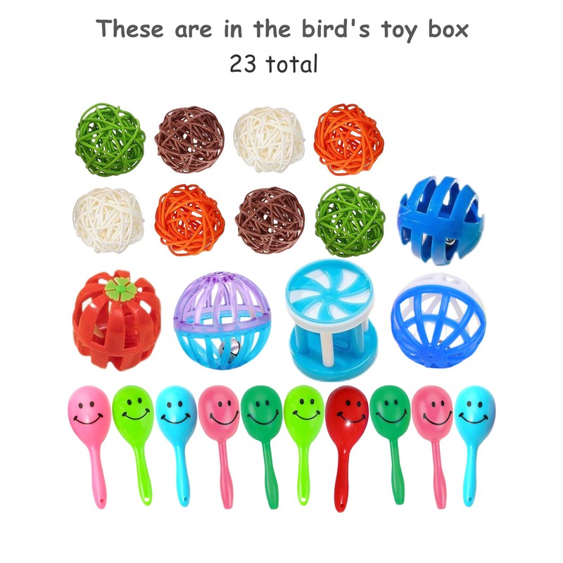 - Variety of 23 bird toys in 7 styles: Includes 8 natural vine balls, 5 plastic bell balls, and 10 bird toy rattles, perfect for parakeet toys, bird toys for conures, and small bird toys.