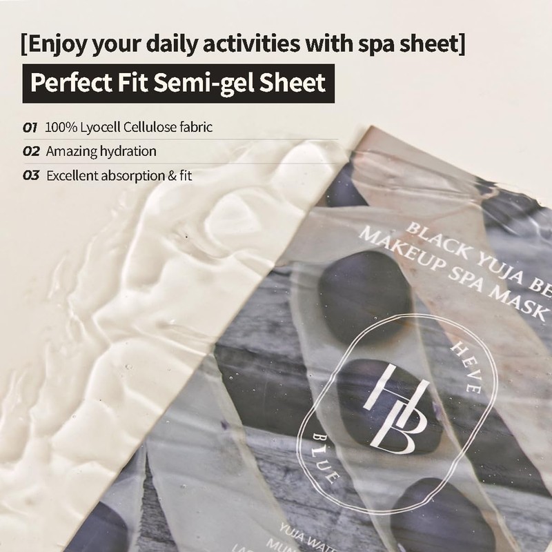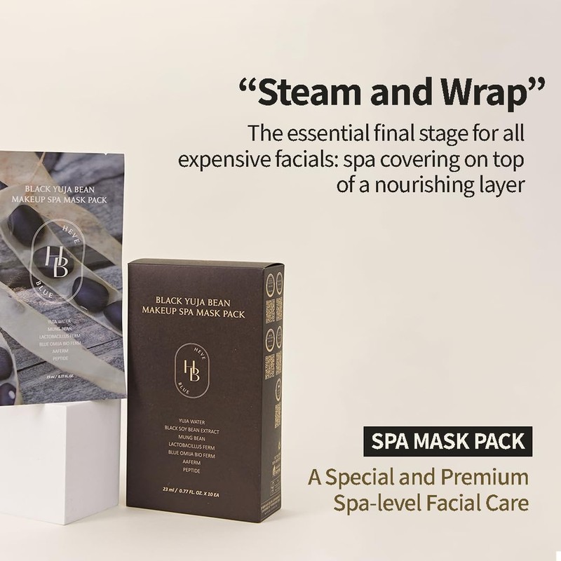 HEVEBLUE Black Yuja Bean Makeup Spa Mask Pack 10ea 1. After cleansing, prep your skin with toner. 2. Open the package and remove the mask and film. 3. Use the film from step 2 to give your skin a direct spa-like effect. 4. After 10-20 minutes, remove the mask. 5. Gently pat in the remaining essence to absorb into the skin. HEVEBLUE's exclusive patented Blue Omija Bio Ferm / AAFerm ingredient co-developed with the Korea Institute Of Dermatological Sciences. Infused with black bean and yuja water, this mask utilizes Heveblue's patented Blue Omija Bio Ferm formula to protect and deeply hydrate the skin. The 2-step spa sheet mask blocks oxygen to effectively combat dryness and ensure makeup goes on smoothly.