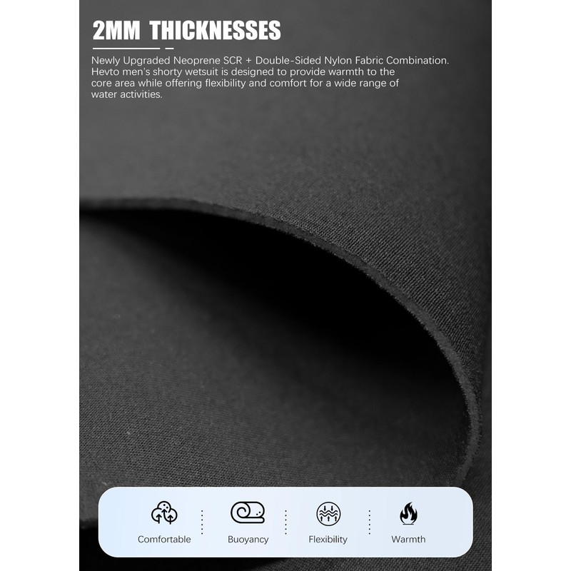 - Thermal Protection: Made with 2mm Neoprene, Hevto wetsuit men offers the right level of warmth for warmer waters. Ideal for swimming, snorkeling, and paddleboarding, the shorty wetsuit provides comfort and flexibility without overheating.