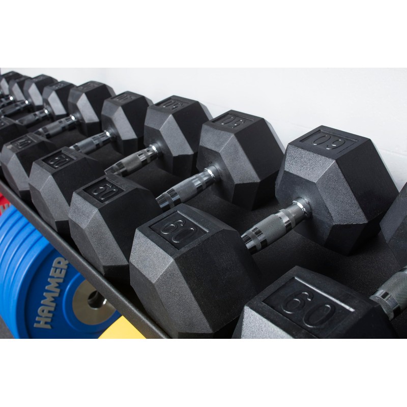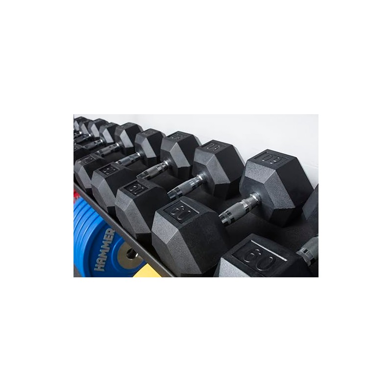 - This dumbbell is a high quality solid cast dumbbell encased in rubber, The hexagon shape of the dumbbell head prevents the weight from rolling around when not in use.
