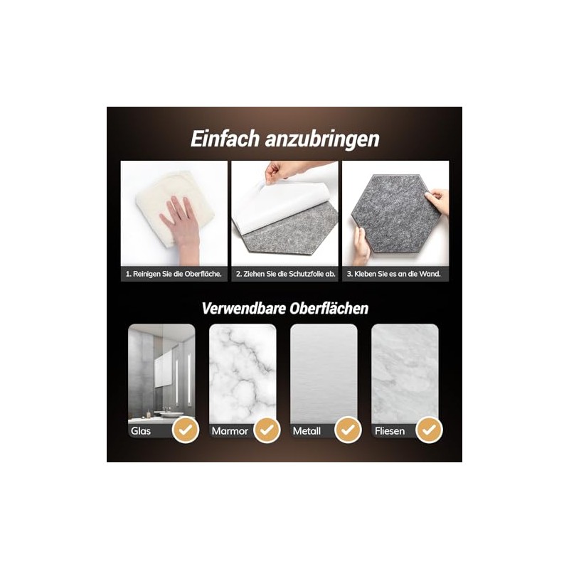 - Einfach zusammenzubauen: Dank der selbstklebenden Rückseite brauchen Sie weder Klebstoff noch andere Tools kaufen. Ziehen Sie einfach die Schutzfolie ab, und schon können Sie die Schallschutzplatte an der gewünschten Stelle anbringen. Hinweis: Diese Akustikplatten können auf glatten und trockenen Oberflächen wie Holz, Glas, gestrichenen Wänden, Metall, Marmor und Fliesen verwendet werden.