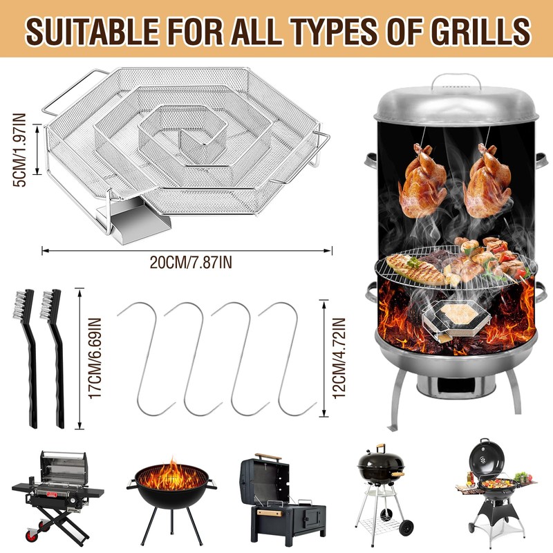 - Rich accessories: the set contains 1 cold smoke generator, 2 BBQ cleaning brushes and 4 S-shaped butcher hooks. To save more space, burnt waste can be removed with a cleaning brush. Stainless steel hooks have a high load capacity and can be used for hanging food. Additional accessories further increase the functionality and comfort of this cold smoking oven.
