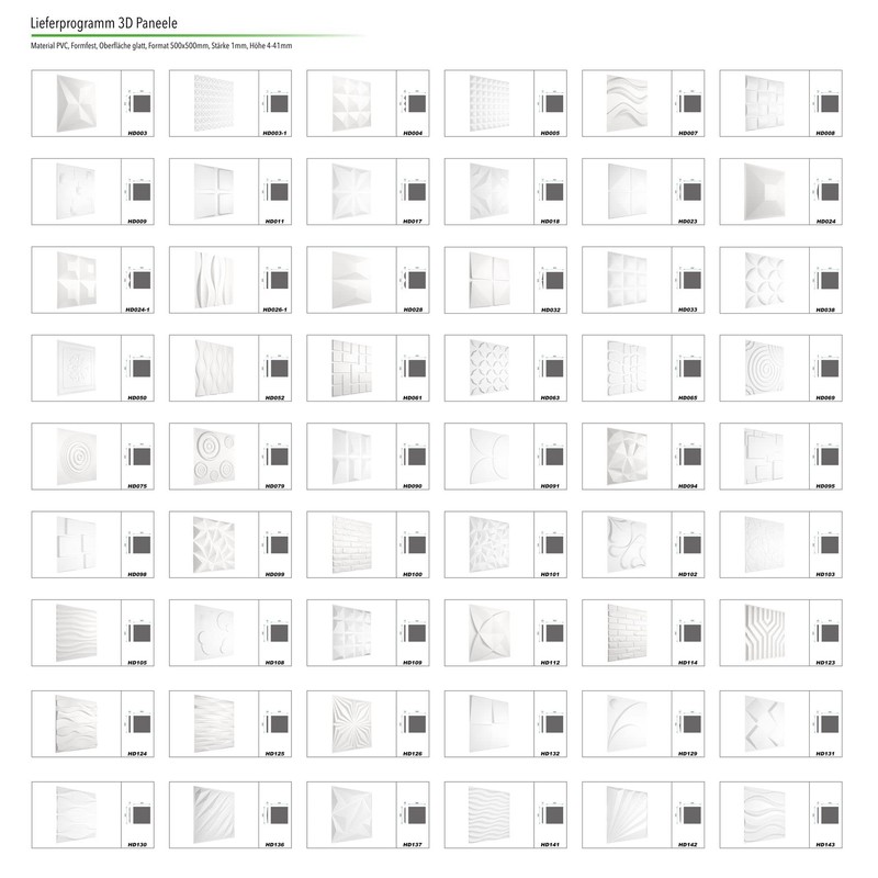 - 0.25 m² 3D wall panel (1 panel), model: HD095, material: PVC, dimensions per panel: 50 x 50 cm, depth: 21 mm, thickness: 1 mm, density: approx. 1620 kg/m³