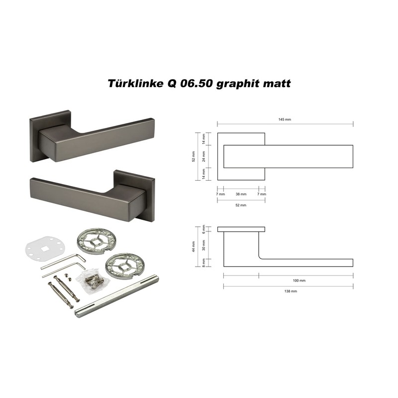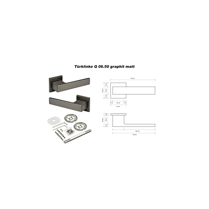 - Door handle Q06.50, colour: graphite matt, handle length: 100 mm, dimensions rosette (W x H): 52 x 52 mm, handle pin (diameter 8 mm): 105 mm for door thicknesses of 37-58 mm, box contents: 1 set of door fittings (left and right), mounting accessories and drilling template