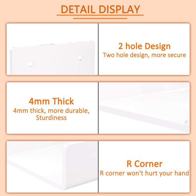 - STURDY DESIGN: The wall shelf is in U shape and hot bending craft. It would be much sturdier than gluing craft. Made in 4mm thickness acrylic and 2 screw holes, the wall shelf can hold up to 5Lbs. You can use it as a wall shelf organizer in any position of your home. Very sturdy and multi-function.