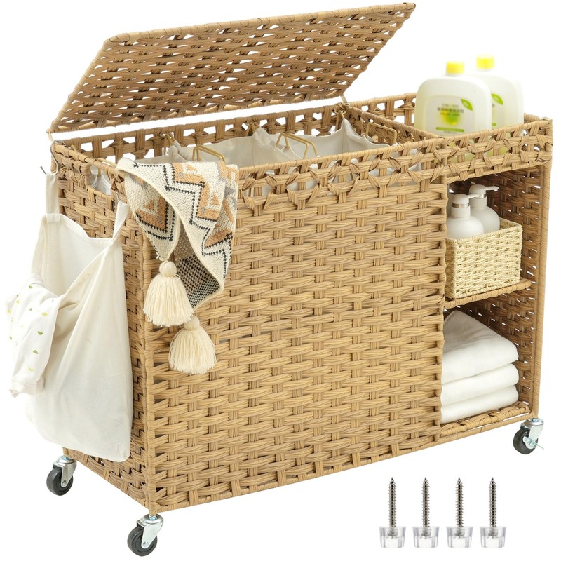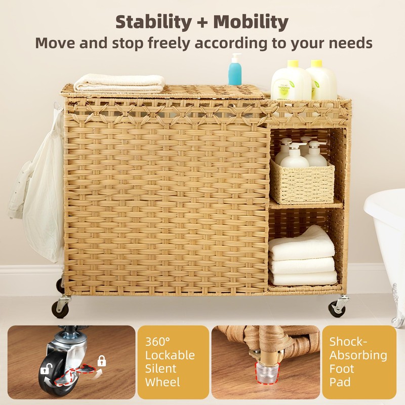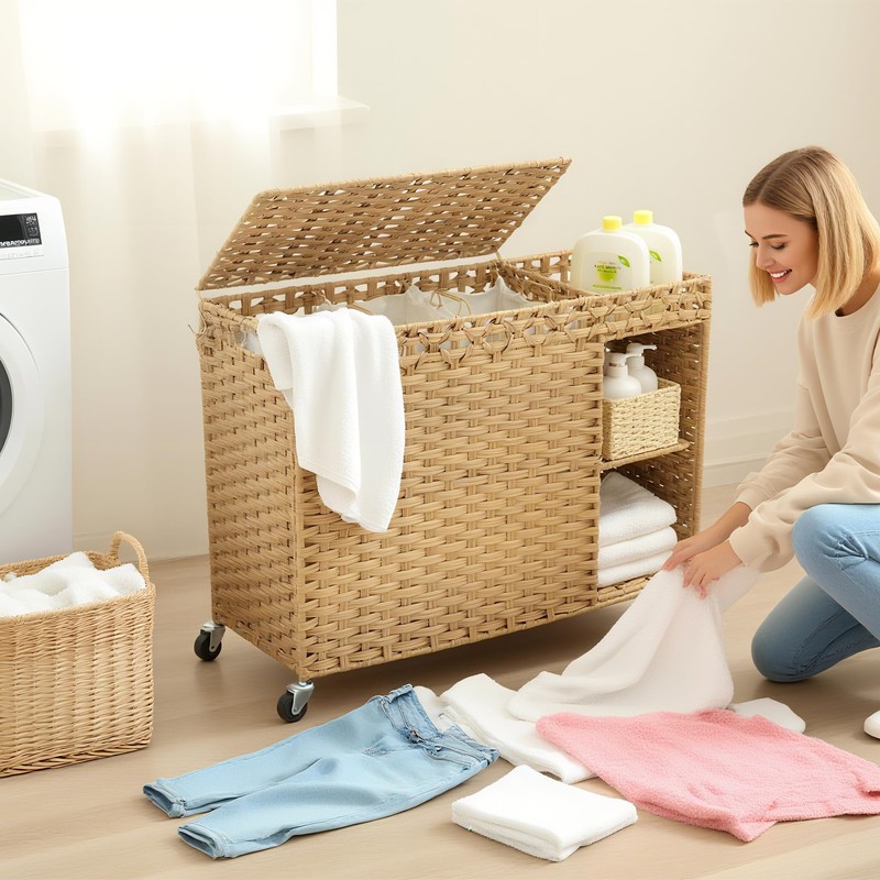 - 【Multi-Zone Wicker Laundry Basket 3 section with Shelves】 Upgraded removable shelves create dual-side organization: left for dirty clothes, right for detergents/softeners – sort smarter, not harder!