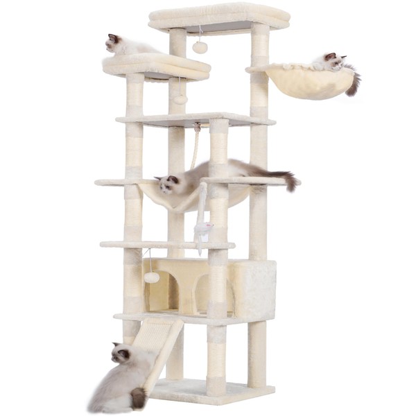 Heybly Tall Cat Tree,78 inch Multi-Level Cat Tower for Indoor Cats,2 Widened Plush Perches Cat Condo with Scratching Board and Big Caves,Beige HCT033M