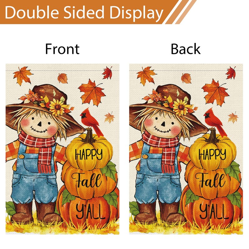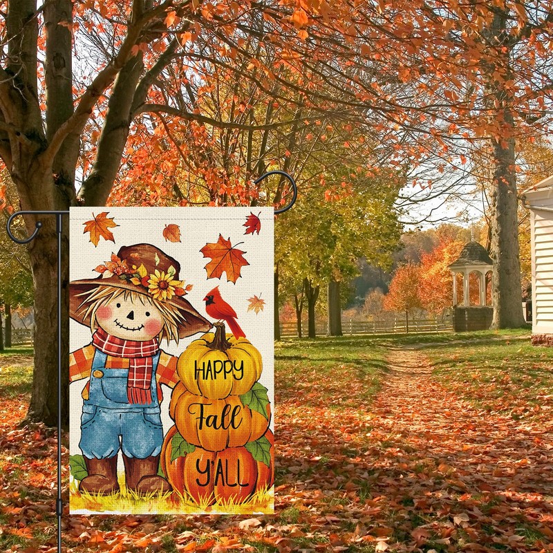 - Fall Atmosphere - This fall themed garden flag is decorated with scarecrow, pumpkin, sunflower and maple leaves pattern and the word of "Happy Fall Y'all", expressing the greeting to guests and adding some festival atmosphere to your home and garden
